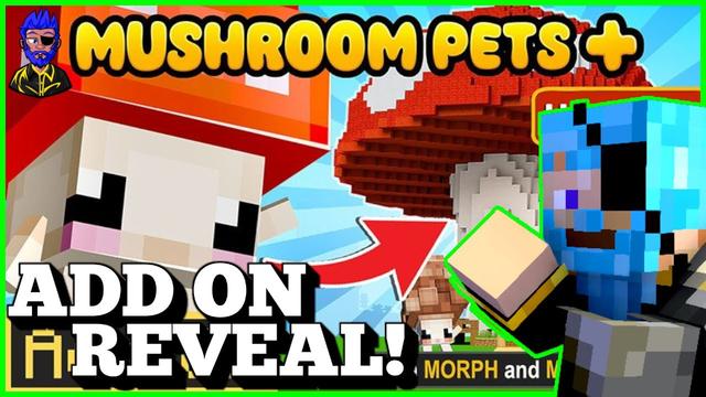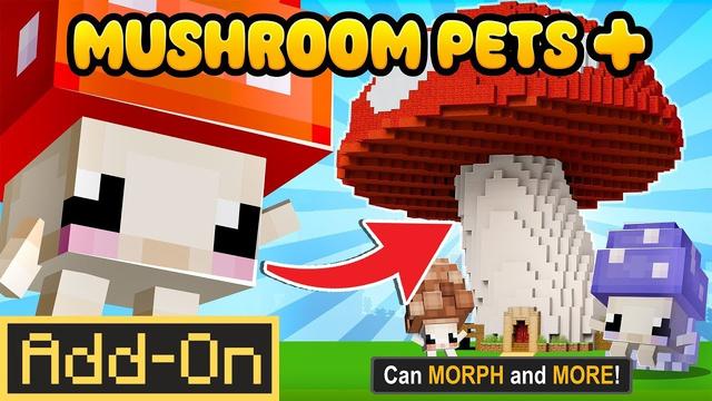 CaptainSparklez presents Mushrooms Pets +: Find and tame 17 UNIQUE mushroom pets that follow you, fight for you, light up dark places, morph, and more! They're the coolest mushroom companions! Ultra cute mushroom mob pets, Pets can morph into MASSIVE mushroom bases + loot, Custom Hats for you to wear, Adorable plushies to collect. Mushroom Pets + works in all worlds!
