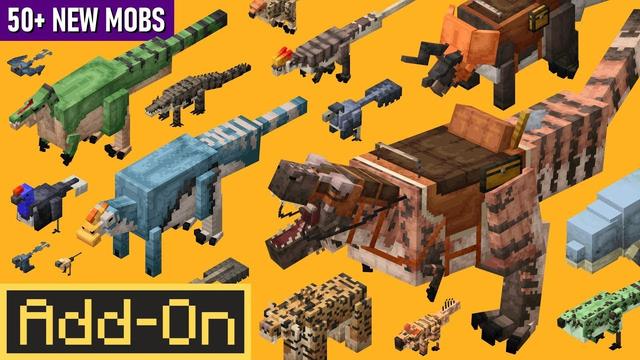 CompyCraft presents Dinosaur Era: Dinosaur Era adds 70+ dinosaurs & other prehistoric animals! Experience a wide range of dinosaurs and prehistoric creatures; from Tyrannosaurus to the Woolly Mammoth, Yutyrannus to Dimetrodon. Many creatures can be tamed, saddled, ridden, and even customized with advanced menus! 70+ dinosaurs, Classic blocky style, Use in any world, Tame menus, Structures, Items.