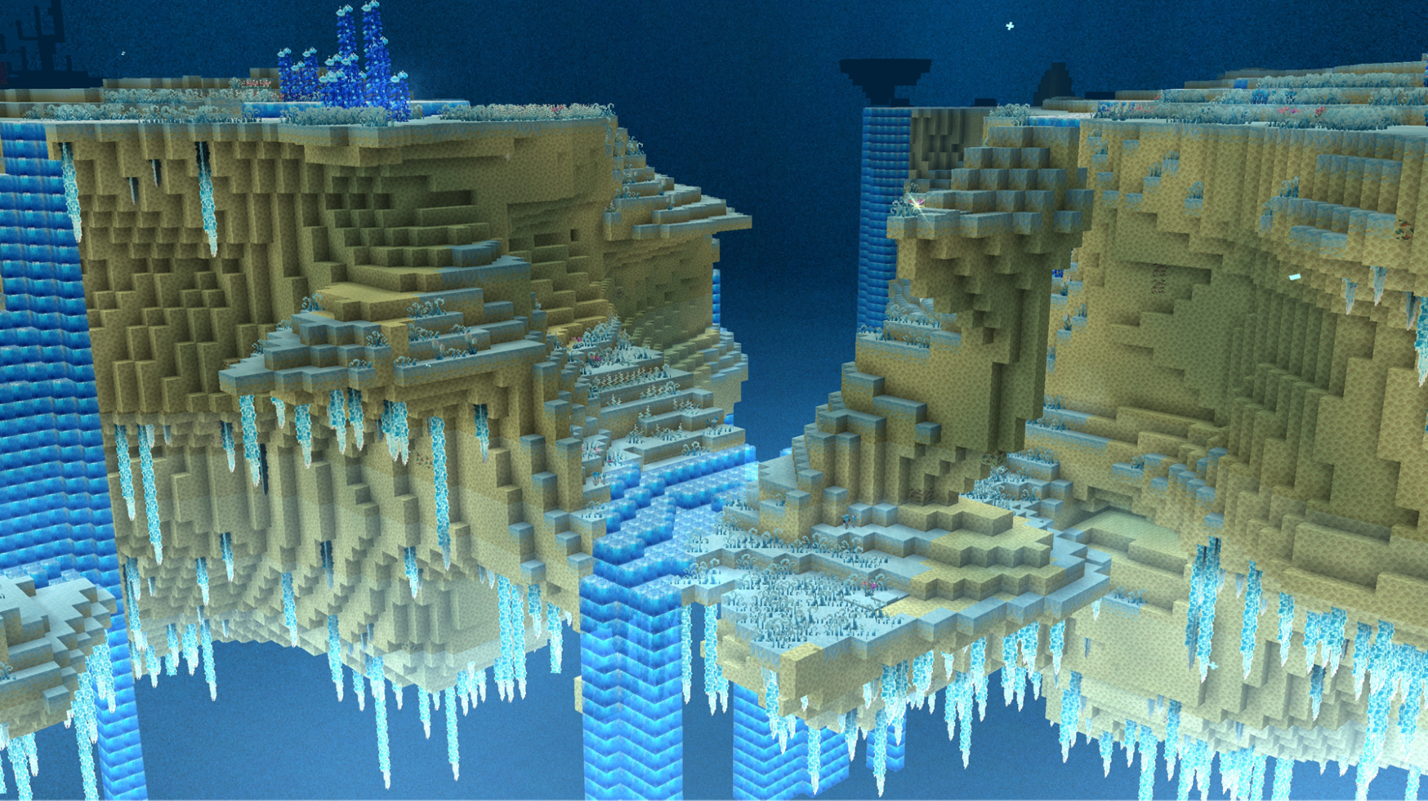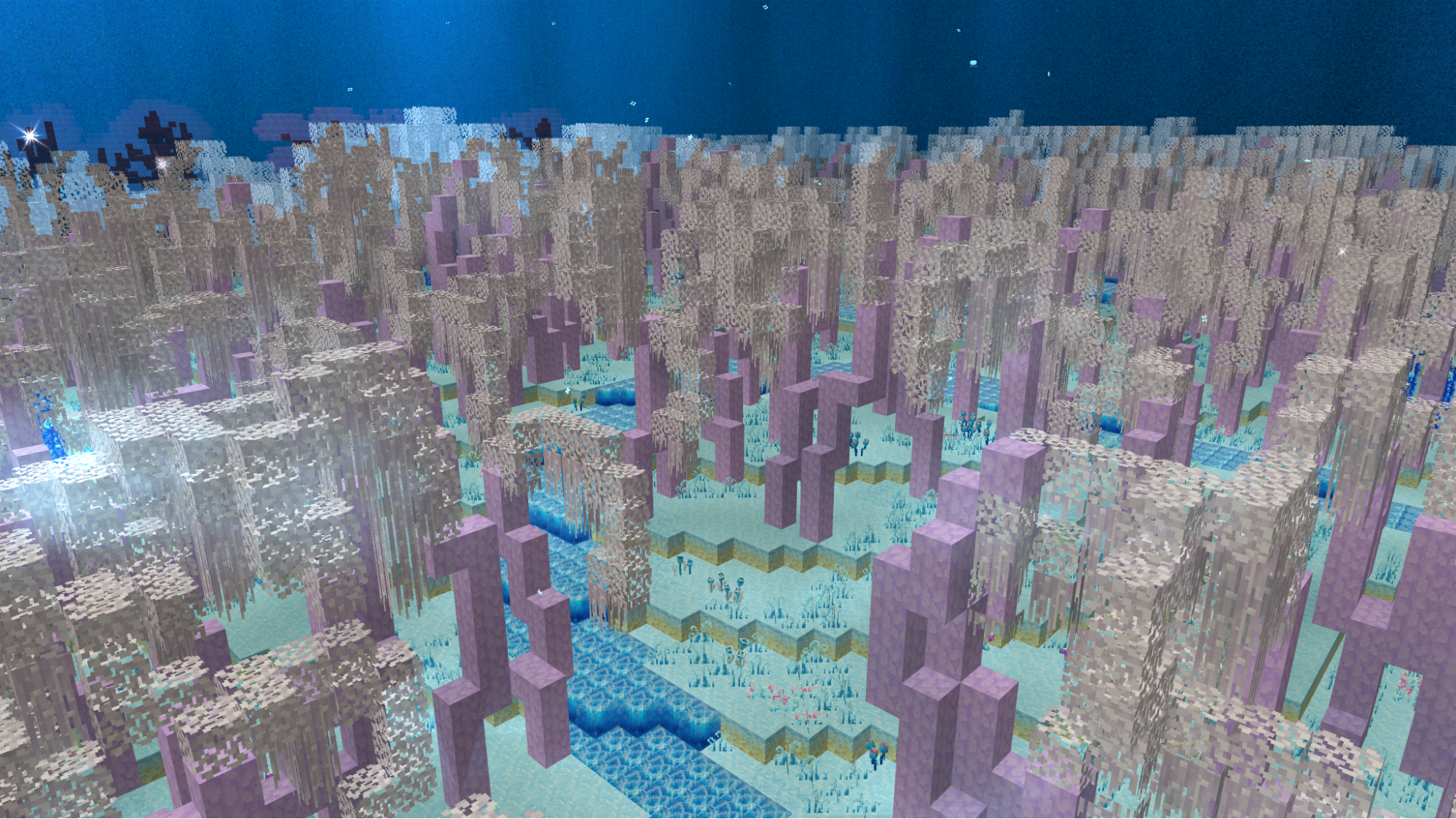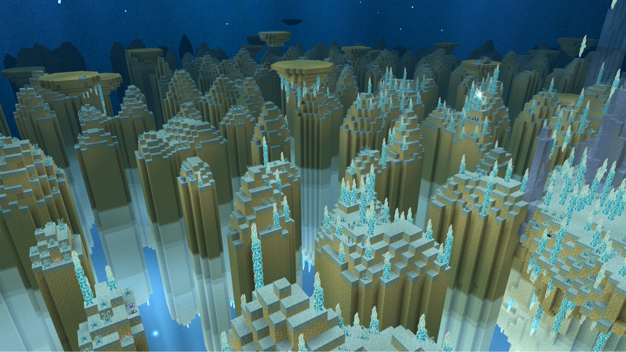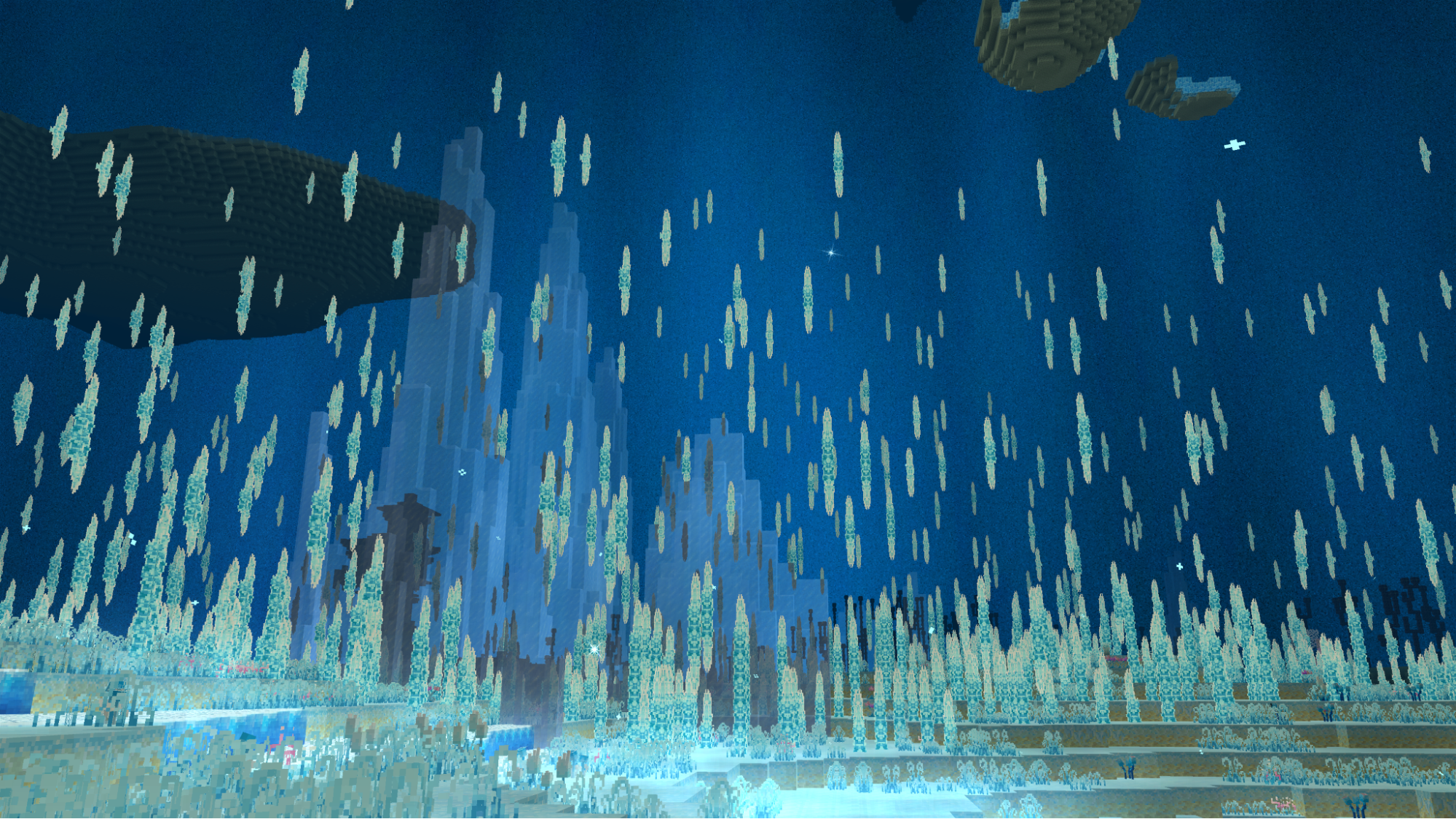 Prism peak is a bright biome, with its particles creating an ever color shifting atmosphere. Making the ice spikes that create a custom looking terrain light up in their colors. Snowflakes and small jellyfish float gently around, adding to the dreamy, weightless feeling of the area.