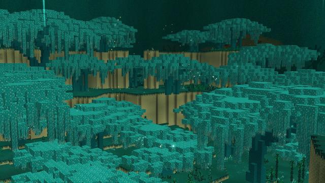Verdant Grove is a very dense forest biome with huge trees whose crowns form a thick roof over the players' heads. The forests extend over a plateau-like terrain.